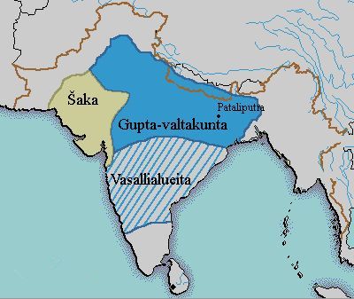 亚历山大帝国 从前2世纪初开始,大夏希腊人、塞人和安息人先后侵入印度;塞人的侵略尤其广泛,他们在整个西印度建立了许多公国。大月氏人成为最成功的侵入者,他们在北印度建立了强大的贵霜帝国,这个国家被列举为古典世界的四大帝国(罗马帝国、安息、贵霜帝国和汉朝)之一。贵霜时代的宝贵产物是大乘佛教和犍陀罗艺术。 6,笈多王朝(公元320年~540年) 贵霜帝国在强盛了若干世纪之后分裂为一些小的政治力量。取代他们在北印度的优势地位的是旃陀罗笈多一世建立的笈多王朝。笈多王朝是孔雀王朝之后印度的第一个强大王朝,也是由印度人建立的最后一个帝国政权,常常被认为是印度古典文化的黄金时期。与孔雀王朝一样,笈多王朝的发源地是在摩揭陀;这个王朝的头几位君主都是征服者,他们确实统一了北印度,但在南方则并没有扩张得太远。
