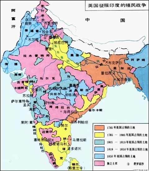经营英国在印度事务的主要实体是不列颠东印度公司,这个商业贸易企业由于莫卧儿帝国的分裂而得以步步蚕食各独立印度王公的领土,最后成为印度的实际统治者。早期东印度公司尚不能与帝国政府直接对抗,但成功地利用个人友谊从穆罕默德·法鲁赫·西亚尔皇帝手中获得贸易特权。在西亚尔死于宫廷阴谋之后,一连串短命的皇帝先后上台,帝国陷入混乱,偏远的省份纷纷独立。马拉塔人的力量十分强盛,他们从帝国手中夺取了拉贾斯坦、古吉拉特等地;但内部斗争也损害了他们,使其从统一的王国变为松散的联盟(马拉塔国家联盟)。 1739年,波斯国王纳迪尔沙阿对印度进行了一次可怕的入侵,焚掠德里,并割走了印度河以西的所有印度领土。此后阿富汗的统治者艾哈迈德沙阿又多次侵略印度,特别是在1761年的第三次帕尼帕特战役中,印度本土唯一有希望取代莫卧儿人建立强大政权的马拉塔人也遭到他毁灭性的打击。这些事件在客观上为东印度公司建立殖民统治创造了便利。由于印度国内的各种力量均遭重创,英国人有可能动用武力来实现目的。 1757年,英国军官柯拉夫在普拉西战役中打败了得到法国支持的孟加拉王公西拉杰·乌德·道拉,使孟加拉成为东印度公司的傀儡,为征服整个北印铺平了道路。在1764年的布克萨尔战役中,英国人粉碎了企图摆脱控制的孟加拉王公米尔·卡西姆与莫卧儿皇帝的联军,徒有虚名的莫卧儿帝国政府从此也听命于殖民者。此后历经迈索尔战争和三次马拉塔战争,印度国内比较强大的反抗英国统治的力量基本上都被消灭。1818年马拉塔人势力最后覆灭后,大多数印度王公都承认了东印度公司的宗主权。最晚被英国兼并的印度领土有信德(1843年)、锡克人控制的旁遮普(1849年)、贝拉尔(1853年)和奥德(1856年)。 由于殖民者的种种不利政策,1857年爆发了著名的印度民族大起义。起义的直接导火索是在印度裔士兵中流传关于分发涂有动物油脂的子弹的传言,这严重地触犯印度人的宗教信仰。起义主要由封建王公领导,并推举末代莫卧儿皇帝巴哈杜尔沙阿二世为名义上的领袖。穆斯林和印度教徒都积极参加,暴动迅速扩及印度领土的三分之二。英国人集中全部力量,利用锡克教徒和廓尔喀雇佣军的人力,严厉地镇压了这次起义。1857年印度起义带来了重大的政治后果。英国政府认识到其印度政策存在严重弊端,开始进行重大调整。1858年通过的《改善印度管理法》取消了东印度公司,由印度事务大臣接管其全部职权;并成立以印度总督为首的印度政府。英国人也正式结束了已无存在意义的莫卧儿王朝,将巴哈杜尔沙阿二世流放到缅甸。此后印度进入由英政府直接统治的时代。 英国直接统治下的印度(称英属印度)分为13个省,其中包括缅甸。另外约有700个由印度王公统治的土邦在英国严密监督下存在着,这种土邦占整个印度面积的五分之二(有些省里也有土邦)。以印度为根据地,在亚洲遏制俄国扩张的思想使一些英国官员致力于西北方向扩展英属印度的疆域,结果引发了1878年至1880年的第二次阿富汗战争。在社会和经济方面,英国人在创立现代教育体系、修筑铁路、发展印度本地工业等问题上有所建树。自19世纪中期起,英国资本大量输入印度,印度资本主义得以快速发展;在此基础上产生了印度资产阶级,其精英阶层将影响印度的未来。以罗姆·摩罕·罗易为代表的知识分子掀起了印度的启蒙运动,其意义在于通过对印度教进行改革使古老的印度社会向现代文明转变;梵社、雅利安社、罗摩克里希纳传教会等宗教改革社团的积极活动,终于在推动社会进步、唤醒民族意识上产生了巨大作用。在进行印度教改革的同时,比较激进的印度知识分子发起了政治改革运动,要求英国政府给予印度人民更高的权利。在孟加拉、孟买和马德拉斯三大管区都出现了民族主义组织。 1885年,印度国大党成立,该党的早期政治主张主要是要求实行代议制。后来鉴于国大党的政治影响,印度的伊斯兰教领袖们认为穆斯林世界在适应现代社会方面落后印度教徒太多,遂于1906年组建全印穆斯林联盟。英国人有意识地利用了印度教徒和穆斯林之间的矛盾。 在1885年以后,印度几乎每年都有民族主义者的集会,但维多利亚时代的英国官僚显然漠视印度人的诉求。英国人在印度的统治目标仅仅是避免出现饥荒;1906年以前,尽管缓慢地推行着公职人员的印度化,但英国政府从未考虑过让印度自治。1905年时任总督的寇松勋爵草率地将孟加拉划分为两个省,结果引发了有政治自觉的印度人的广泛愤怒,反英运动在孟加拉内外迅速发展起来。这次运动由国大党领导,最后因英政府的强力干预而被平息,国大党内部也发生激变(极端派被开除出党)。穆斯林联盟在这次事件中支持英国政府,这说明穆斯林和印度教徒在国家前途问题上已经分道扬镳。1909年英国通过莫莱-明托改革法案,规定穆斯林和印度教徒在立法机构改选中实行分别选举,此后教派政治成为制度,印度民族运动分裂。 2,印巴分治 第一次世界大战对印度民族主义的发展带来了重大影响。印度精英阶层在战时积极支持英国,希望以此换取民族自治;但英国在战后的行为令他们大失所望。英政府在战争结束后继续执行军管法令,而且还制订了新的镇压法案(罗拉特法)。1919年4月13日发生英军屠杀印度群众的阿姆利则惨案。这些事