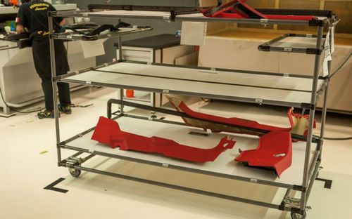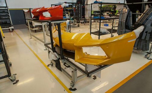 静静躺在一旁等待装配的前保险杠总成。单独拿出来看,兰博基尼的保险杠绝对算得上是艺术品级别的工业产品。