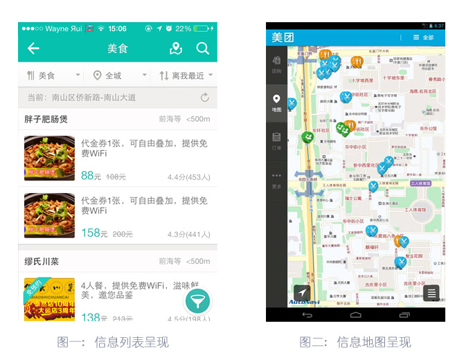 美团的界面有列表视图和地图视图,两种界面能够让用户查看不同的方向,列表包括详细的信息内容和价格,而地图则显示了餐厅的地理位置。