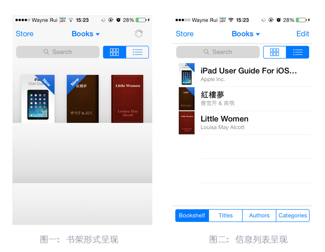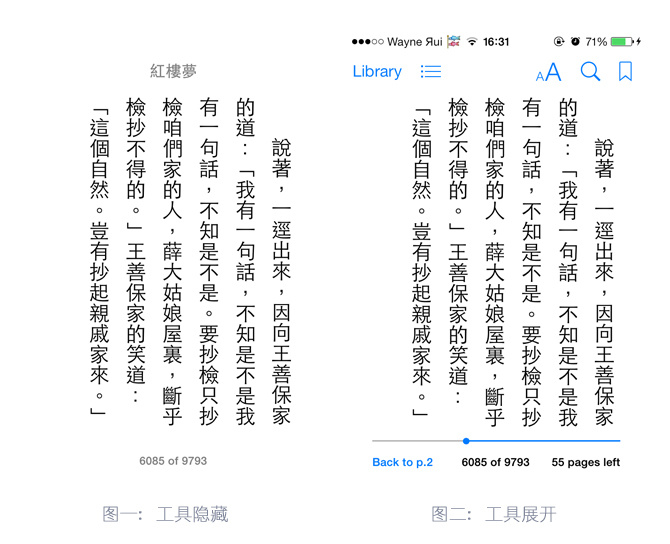 在ibook中也同样的表现了两种显示,但你会发现一种界面明显优于另一种。事实表明,列表界面能让用户更加轻松的辨认出图书和作者,或用书名做快速搜索,列表中按照字母快速排序而书架中的并不是。大量图书存在情况下,通过图书封面快速查找可能性也随之降底。 别让虚拟元素抢了地盘所谓虚拟设计元素是指像用户提供关于屏幕内容的信息或者操作该内容的命令。这些虚拟元素通常用底层的系统提供。例如PC端他的虚拟元素就是PC的各种指令如任务栏,系统托盘区等。而软件PS工具中的菜单栏,工具栏等等。 在移动端使用这些虚拟元素的代价很明显,他们会占据空间,而压缩了内容的区域。