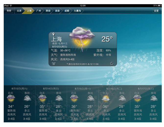 图二的显示方式可以呈现更多的新闻,这才是人们的实际使用。图一相比更增加了用户一步操作,虽然好看但华而不实。 为什么用户在日常使用中更偏爱普通且有点无趣的设计? 这是因为这样的设计能让用户一眼看到更多内容。 第二个案例则是成功浪费ipad的屏幕空间,它让大多数的天气信息密集的排布在底部,而将大部分屏幕的空间用一张纯粹的图片做装饰,这样的默认设计让人乏味。