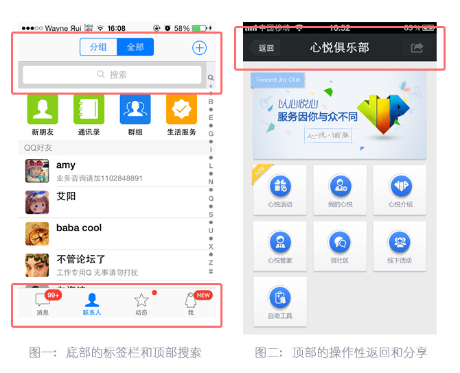图一中你会发现这些虚拟的元素,让有效内容显得更少,然而也会随着系统自带的一些元素不断叠加,经过堆积的虚拟元素通常会占据一半的屏幕空间。那如果我们将这些元素暂时隐藏其实也是很危险的,因为用户对看不见的部分通常是忽略的。那该如何是好?!!! 其实只要你善待他们他们自然会用更好的姿态回报你: 1. 考虑将这些虚拟元素设计的更简单有效 2. 提供自始至终的一致性,让用户记住你这些虚拟操作正在处于隐藏状态,而他的操作可以不断重复这样的模式。3. 通过内容的错落差,上下文提示和渐进式暴露方法降低隐藏带来的复杂性。