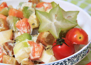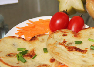 月饼沙拉 月饼沙拉您尝过没有?水果馅的月饼最适合拌沙拉,加点蔬菜、水果,拌上沙拉酱,味道特别好。 把凤梨月饼切成小块,在冰箱里找出白菜、苹果,拌上沙拉酱,三分钟不到就做成一道菜。月饼和水果蔬菜一起吃,本来就解腻,再配上沙拉酱,更特别。 烙成新月“饼” 软糯更飘香