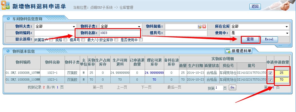 操作步骤:生产管理——生产退料申请;进入页面后,按照名称筛选查询;得如下图所示页面: