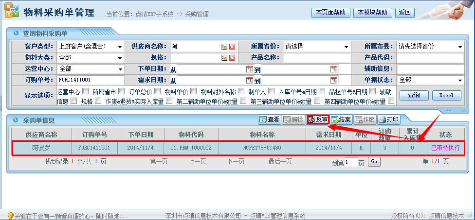 点晴模切ERP采购管理—采购单反审结案管理操作