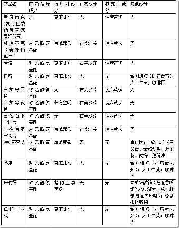 另外,儿童用药时应当尽量选用儿童专用的药品,或是仔细阅读说明书中关于儿童用法的说明。在没有了解清楚儿童用法和用量时直接给儿童使用成人的药物(不仅指感冒药)是有很大风险的。 最后还想提一点,那就是过敏的问题。上面提到的药物都可能引起过敏,连抗过敏药也不例外。如果在用药过程中发现说明书中没有说明的、异常的不适症状,有可能是由药物过敏造成的,这时应停药并到医院就诊。 最后奉上常见感冒药成分表,祝大家健康~~