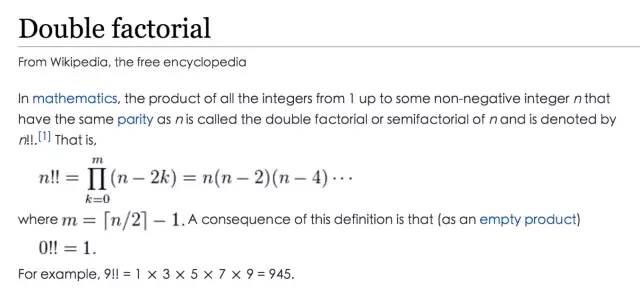 这时候也许会有朋友会大声疾呼说不对,更大的数字应该是“81105!!”,一个数阶乘的阶乘,那岂不是更大? 但是在数学领域里,两个叹号连一起是有名词解释的,这叫做“双阶乘”,来看维基百科里的解释。