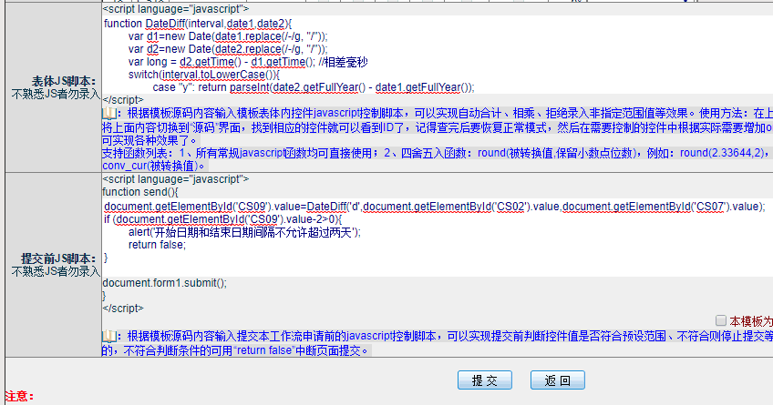 然后在表体JS脚本中输入日期相隔时间函数: