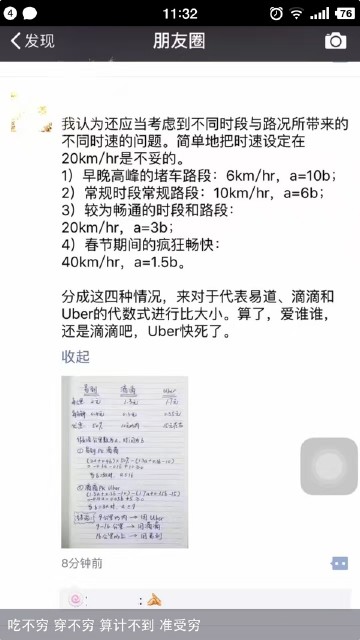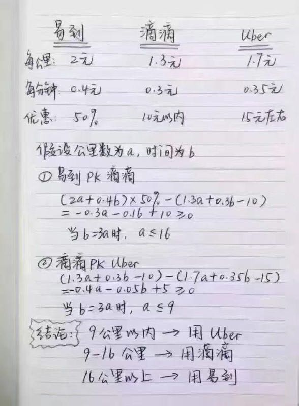 咱们再反过来看看这个设计,简直接近完美,在内容上: 1) 可读性好,除掉公式一共没有超过100个字,而且没有生僻字,用户全都认识!别笑,这点很重要。 2) 内容有趣吗?有!有料吗,有! 3) 合时宜吗?大热天,挤地铁、公交,还是选择打车呢; 4) 能捅开读者的情绪吗?便宜,捡便宜,这是王道!核算成本是写在我们记忆深处的一段代码,无人避免; 5) 最难的就是不留痕迹,他也做到了!一张手写的草绘,太像邻家大姐的总结了,计算方式太亲民,结论实用了!好嘛,完全丧失抵抗,所有潜意识中的防备被攻陷了! 在传播性上的设计也堪称完美: 1) 传播门槛低,就一张图,一键转发; 2) 符合读者利益吧,省钱,这是本能!话说的还好听,我们老说某某皇帝,听信谗言,我们也一样,凡是符合我们利益的,转弯抹角的赞美我们的,我们也听信谗言! 3) 符合社交利益吧,转发出去显示了我的体贴,还有趣! 4) 还不自知。 最后再看效果,让人们不知不觉的以为:这三家公司在同一个量级上,只是他们各有侧重,他们各能为我们所用。而事实上,易到的市场占有率不足2%,与两位强者根本就不在一个档次上,而读完软文的感觉,是三家三分天下的感觉,是至少20%的市场份额的主儿。(神州哭死在江南春的电梯里) 1) 宣传了品牌,让读者感觉到易到是是一线品牌,是主流产品; 2) 明确了定位:明确了易到的定位和功能,就是适合走远道,比如去机场啥的; 3) 植入了心智:用户还真就记住了,跑远路,用易到! 其实呢,谁用谁知道! 米兰·昆德拉说过“他们只有在安全的时候才是勇敢的,在免费的时候才是慷慨的,在浅薄的时候才是动情的”。是的,主创人员让我们做到了!应该给主创人员加薪,给期权,而且给乐视的期权! 据说,人民群众还自发的产生了二次内容创造,天A!