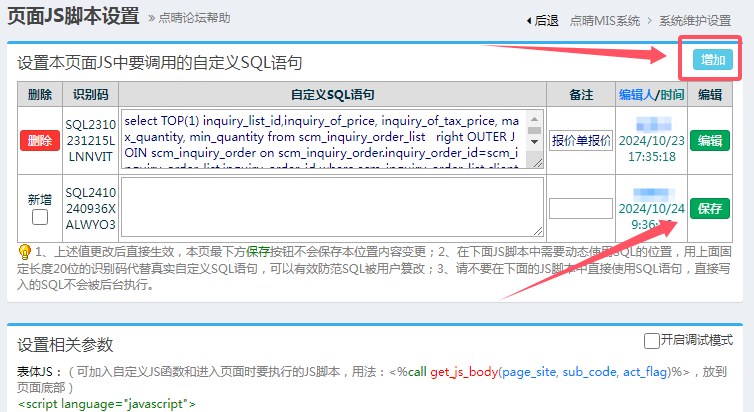 页面动态JS加载脚本,是点晴MIS系统中一项非常重要的功能,可以动态加载JS脚本、自定义SQL语句获取JSON返回值等,从而对页面上的元素进行更为个性化的控制,以及增加新的功能。为了避免动态JS加载自定义SQL语句时,别有用心的人员通过浏览器调试模式自行修改自定义SQL语句给系统带来安全隐患,点晴MIS系统页面动态JS...