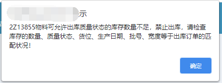 出库操作提示:XXX物料可允许出库质量状态库存数量不足,禁止出库,请检查库存的数量、质量状态、货位、生产日期、批号、宽度等与出库订单的匹配状况! 以下图所示出货单为例进行分析: 首先确定物料编号,仓库发货位置,之后到库存表查询对比:需发货编号为:02.CS.1000022,需发货仓位为1号成品仓。到库存查询...