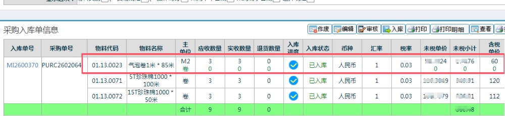 点晴ERP中原材料在采购入库单上有价格金额,但对账单上没有显示金额,是什么原因导致? 这个物料启用了多单位采购,可以看到上面按卷采购的单价=0,应该采用按照M2价格进行对账即可。