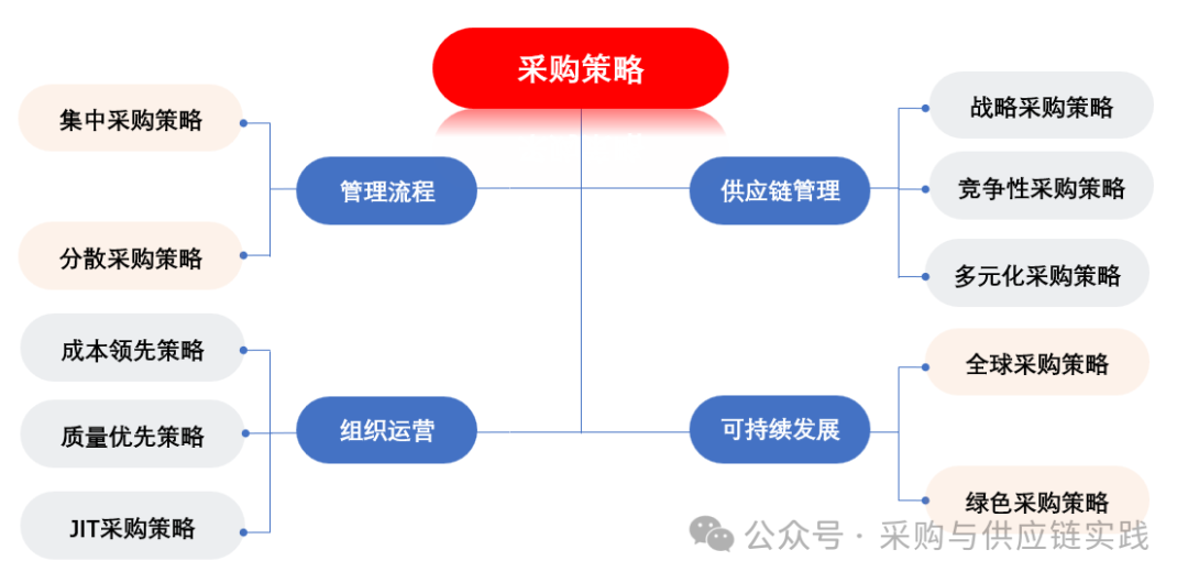采购策略是指企业在进行采购活动时所采用的一系列计划和决策方法。包括如何选择供应商、确定采购数量、管理采购成本、优化供应链等方面的管理方式。采购策略的目的是确保企业能够以合适的价格、质量和时间获取所需的物资或服务,以支持其业务运营和战略目标。以下是一些常见的采购策略:一、从品类管理和组织流程角度区分。1、集中采购。将采购...