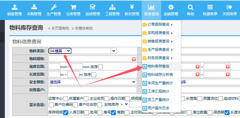 在哪里可以查看到模具有多少库存数量?​在报表查询-》物料库存查询中,物料类别选择:模具,如下图: