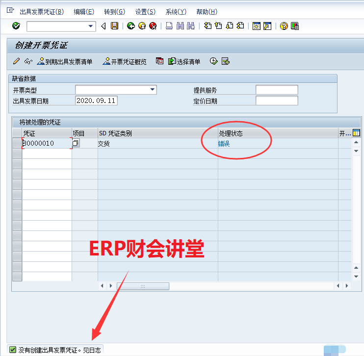 出具发票是SAP销售流程的重要环节,在实际业务中,出具发票可能遇见各种错误,作为用户,我们要学会如何分析错误,解决错误,这样就不用事事都去麻烦顾问了。本节我们介绍如何分析出具发票过程中遇见的问题...授之于鱼,不入授之于渔!VF01出具销售发票失败时,处理状态为“错误”,提示如下信息。根据提示,在日志中可以查看详细的错...