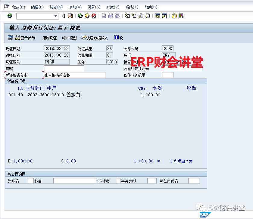大家在SAP中录入凭证时,可能会遇见这种情况,凭证录入到一半时,领导临时交代重要任务,回来的时候SAP已经断掉了,不得不重新录入凭证。有的朋友可能会问,SAP中是否可以临时保存凭证呢?这当然可以,今天要给大家介绍的就是SAP的凭证暂存功能。例如,张三来报销费用,刚录完借方分录,如下图,此时,因事需要离开,可以先暂存凭证...